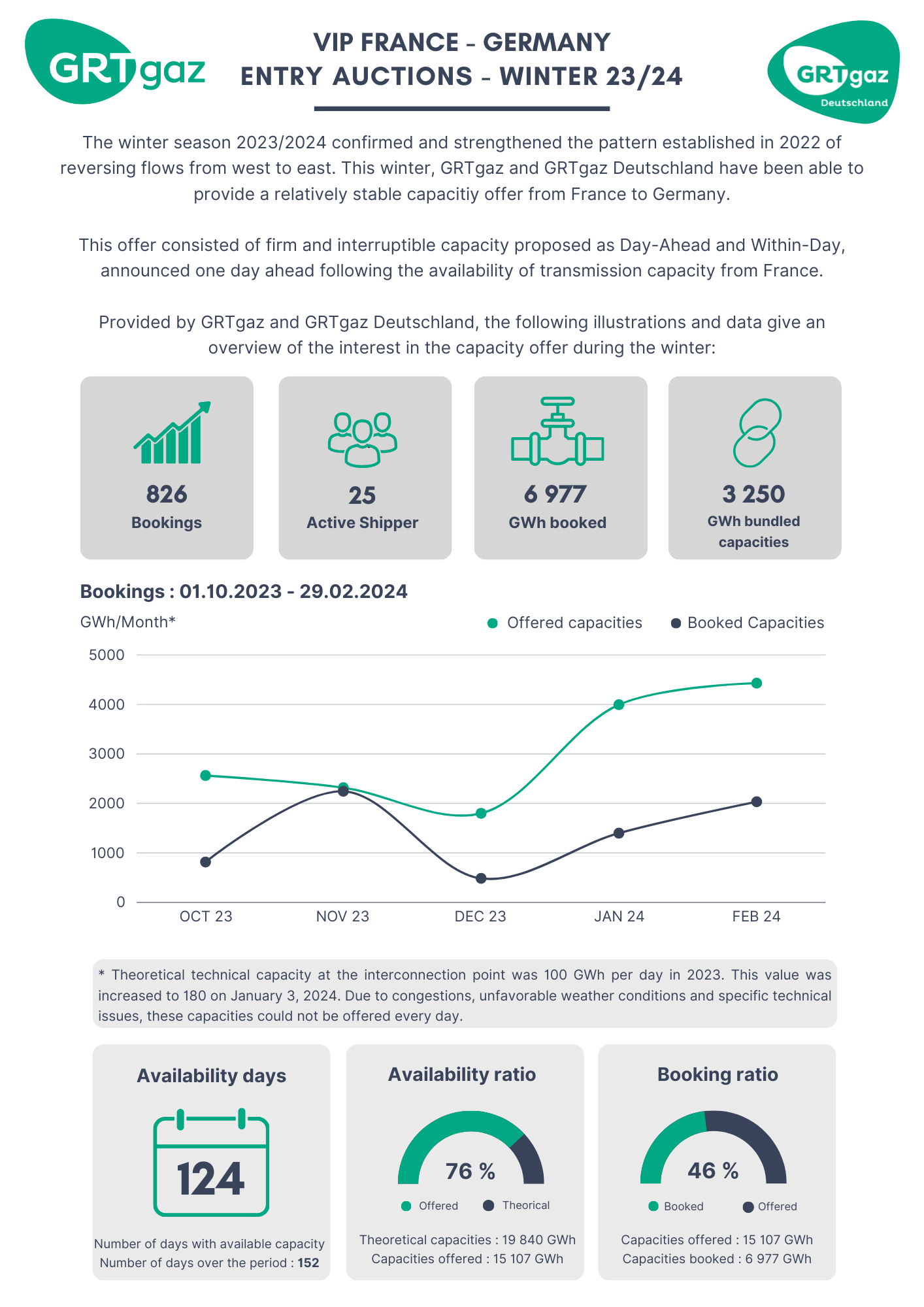From January 3, 2024, NaTran Deutschland GmbH and Open Grid Europe GmbH have allocated additional FZK volumes to VIP France Germany Entry. The French grid operator NaTran is also increasing the maximum available volume on the French side to up to 180 GWh/j. NaTran has published a market communication for further details on the provision and determination of the available daily capacities on the French side.
