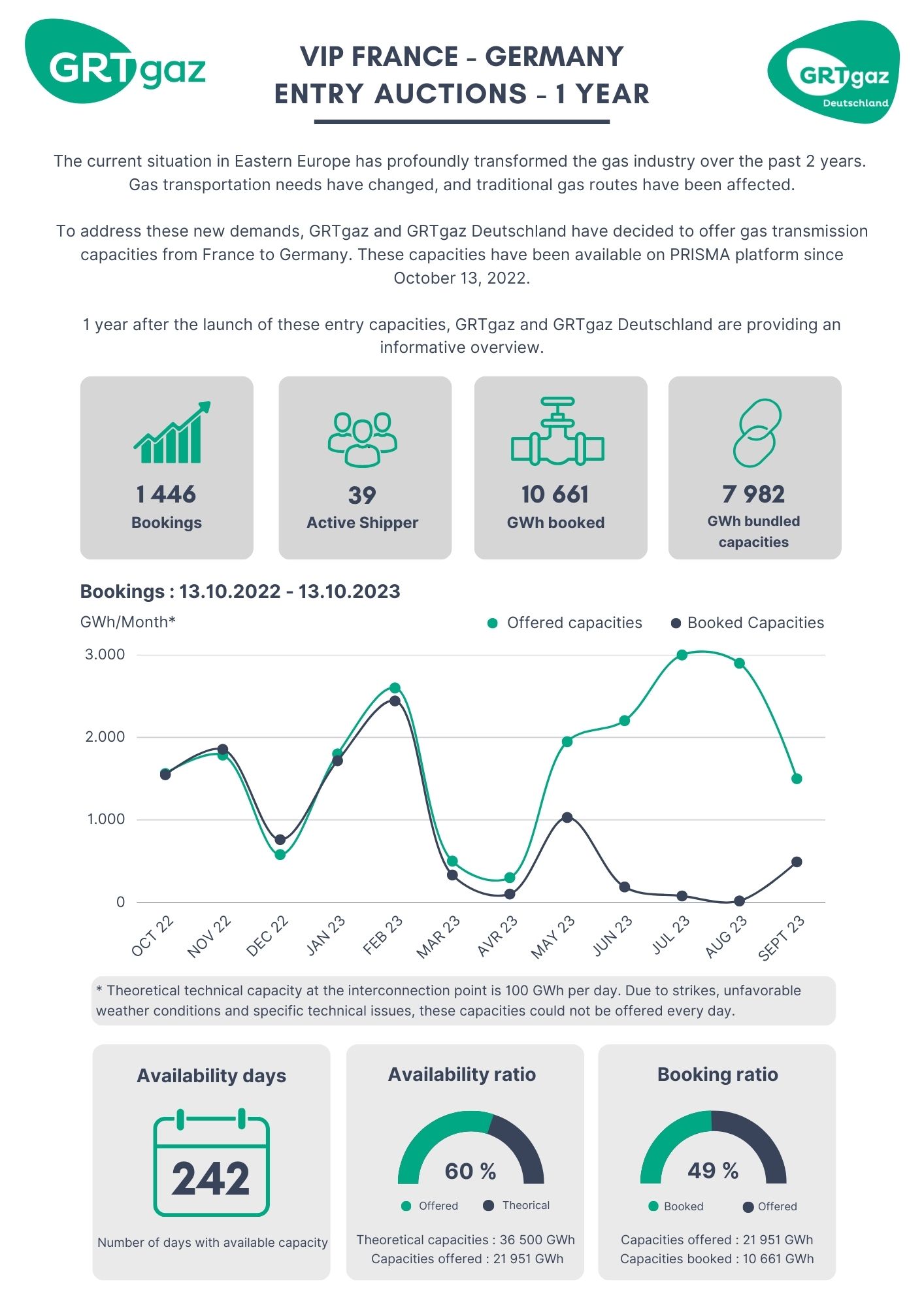 Insgesamt ergibt sich daraus eine neue technisch verfügbare Kapazität (TVK) am VIP Oberkappel Exit von 8.837.782 kWh/h (Summe der TVKs durch OGE und GRTgaz Deutschland bereitgestellt) ab 1. Januar 2024. Die zusätzlichen Mengen stehen bereits für die Monatsauktion Januar 2024 bereit. Die Vermarktung erfolgt durch OGE in ihrer Funktion als verantwortlicher TSO für den VIP Oberkappel.