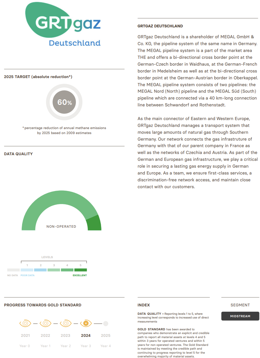 Anlässlich der COP29 in Baku veröffentlichte UNEP (United Nation Environment Program) die vierte Ausgabe des Berichts "An Eye on Methane" (International Methane Emissions Observatory, IMEO). Dieser Bericht enthält die neuesten Informationen über die Reduzierung von Methanemissionen. Für die Qualität der Berichterstattung ist GRTgaz Deutschland seit 2021 mit dem Gold Standard zertifiziert, der höchsten Anerkennungsstufe für unsere Fortschritte in dieser Initiative.